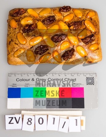 Mikulášské pečivo - perník ve tvaru obdélníku, zdobený mandlemi a jádry vlašských ořechů.